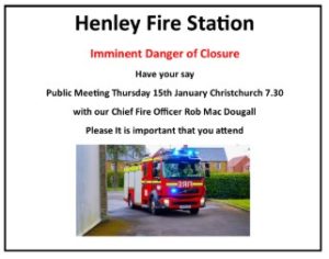 The Henley Fire station is is in real danger of closing and needs YOUR help. There is a PUBLIC meeting this Thursday 15th January, 7.30pm, at Christ Church, Reading Road, Henley. . Please join if you can and also get the message round to your own network. EVERYONE WELCOME.